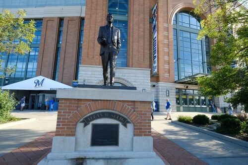 先々代のオーナー、長くMLBのコミッショナーを務めたバド・セリグ像です。 経営者の銅像が球場の前にあるというのは、日本では考えられませんね。 日本ハムの大社前オーナーとか、福岡なら孫さんと中内功さんの銅像を並べてもいいような気もします。 セリグ…