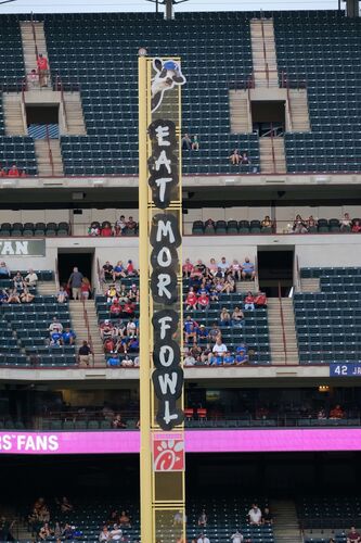 Chick-Fil-A、以前は 普通の看板でしたが、ファウルポールに移動していました。こんなふざけたウシ君をファウルポールに載せていいものかという気もしますが、まあ目立ちますね。